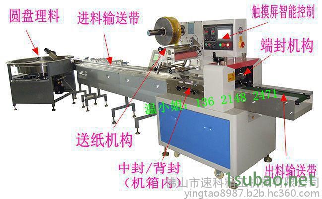 速科SK-320T包裝機械餅干圓盤理料線包裝機,廠家誠邀理料線包裝機代理商此款枕式包裝機適用于包裝薯片、花生、雪餅、餅干、餅干、蛋黃派、巧克力、面包、方便面、藥品、日用品、工業零件、紙盒或托盤等各類有規則物體的包裝。